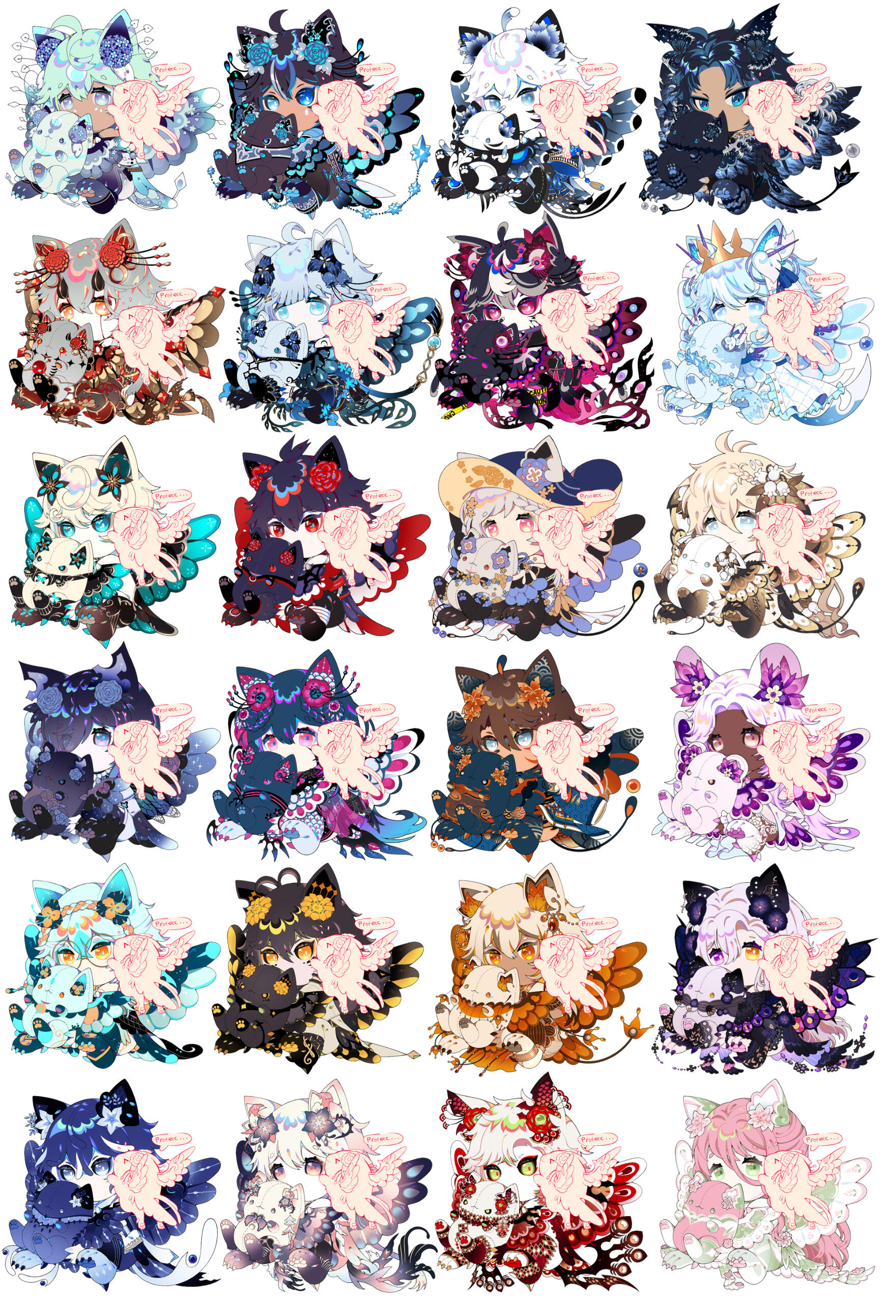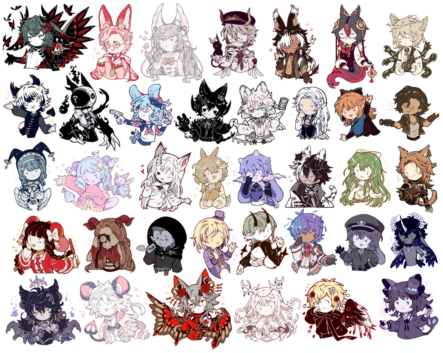 Thick line chibis. This style is drawn with a "box" shape in mind, where I try to draw the chibi within a fixed boxed in area. (Exceptions are made for characters with large appendages such as bunny ears, giant horns, etc.)Note: This style does not come with shading.