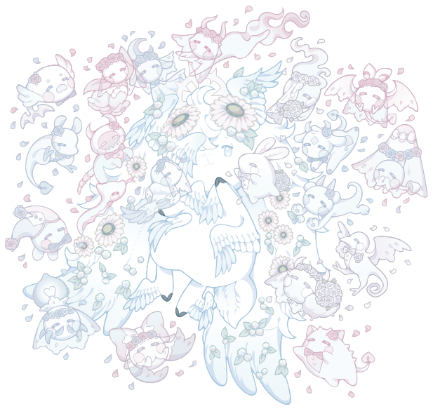 Animations are done via a frame by frame method, and typically are limited to very simple movements such as bouncy isometric angle standing chibis. Some other movements include tail wagging and wing flapping, but this is still a style I am learning.